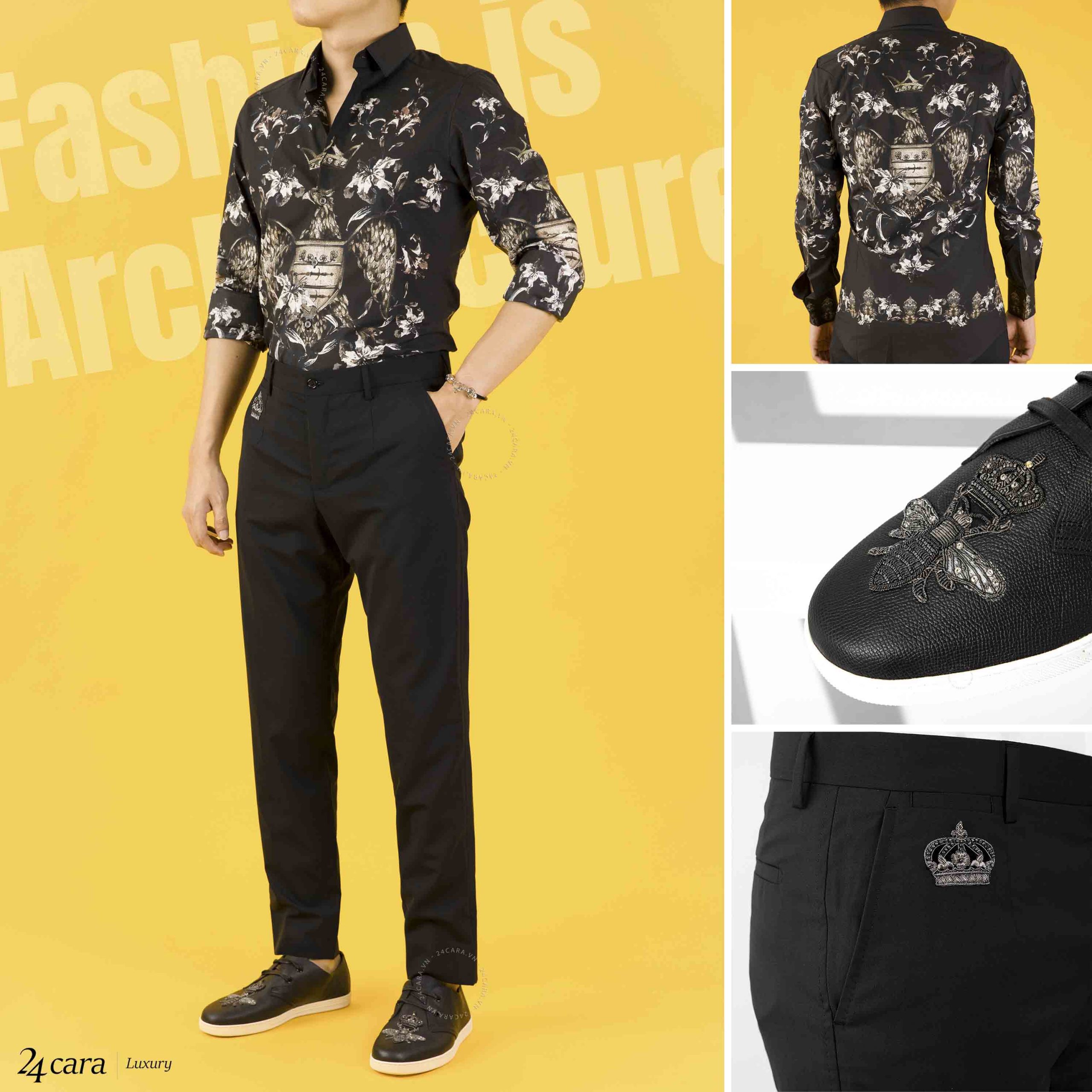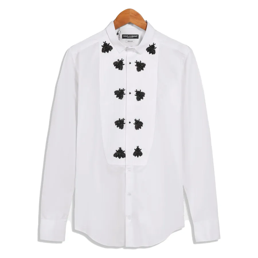 Điểm nhấn của áo sơ mi Dolce & Gabbana thường nằm ở những chi tiết tinh xảo như cổ áo thêu hoa văn, họa tiết in hoặc thêu tay tỉ mỉ, giúp mỗi chiếc áo không chỉ là trang phục mà còn như một tác phẩm nghệ thuật. Sự phối hợp hài hòa giữa nét cổ điển và sự táo bạo trong thiết kế tạo nên phong cách vừa gợi cảm vừa cuốn hút, rất phù hợp với những quý ông yêu thích sự khác biệt.