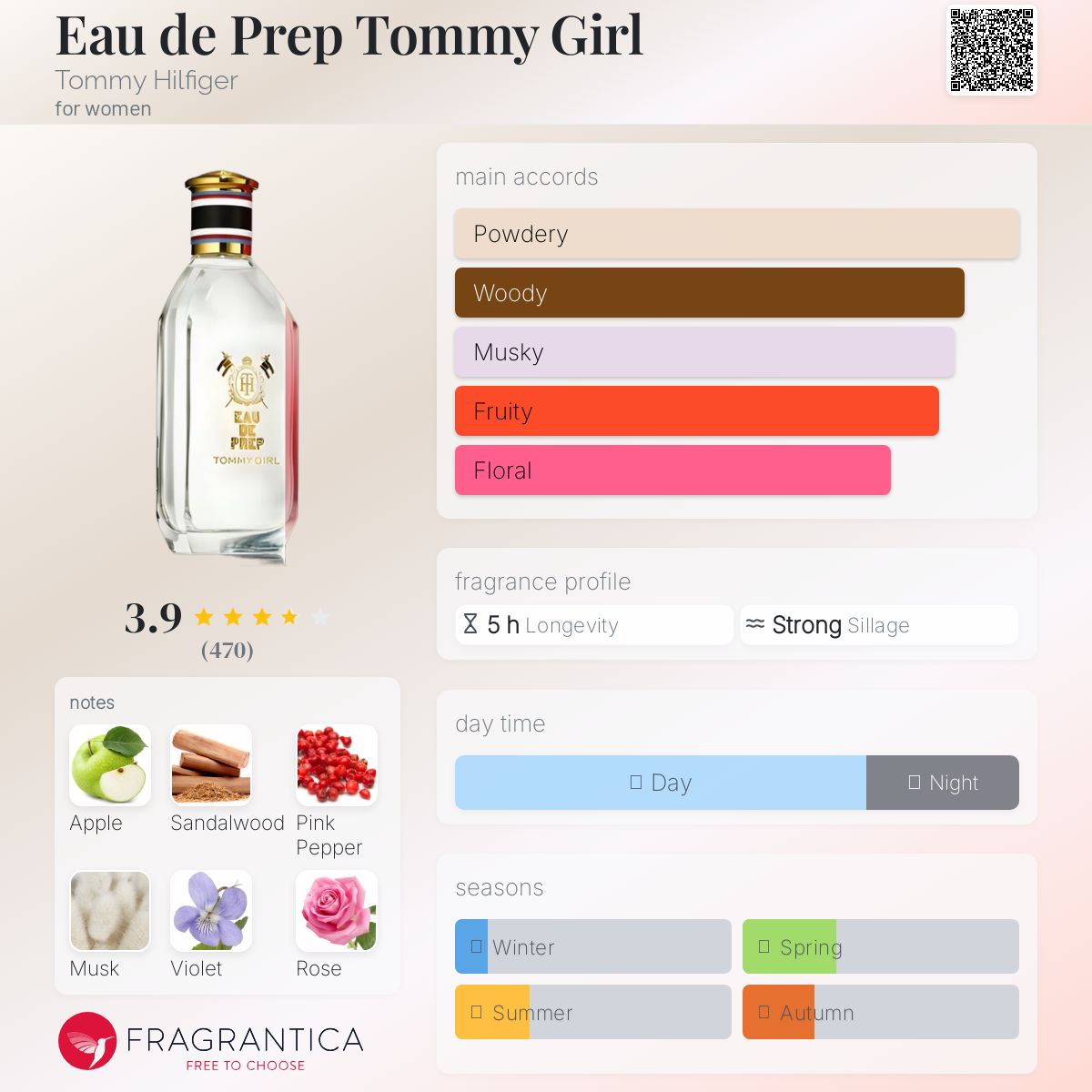 Được khuyên dùng vào mùa xuân và mùa hè, Tommy Girl Eau De Prep tỏa hương quyến rũ trong không khí ấm áp, giúp bạn trở nên nổi bật nhưng không quá gắt gao. Độ lưu hương từ 6-8 giờ đủ để bạn cảm thấy tự tin trong suốt cả ngày dài mà không cần phải lo lắng về việc phải xịt thêm.