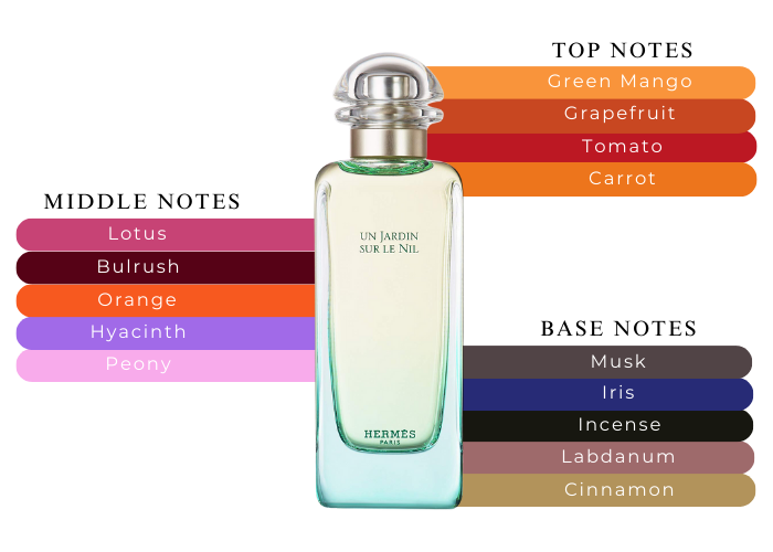 Nước hoa Hermes Un Jardin Sur Le Nil, ra mắt năm 2005, chào đón bạn bằng sự tươi mát và phong phú của hương đầu. Sự kết hợp giữa cà rốt, quả bưởi, cà chua và xoài xanh tạo nên một khởi đầu ngọt ngào, khiến bạn như đang lạc vào một khu vườn tràn đầy sức sống.